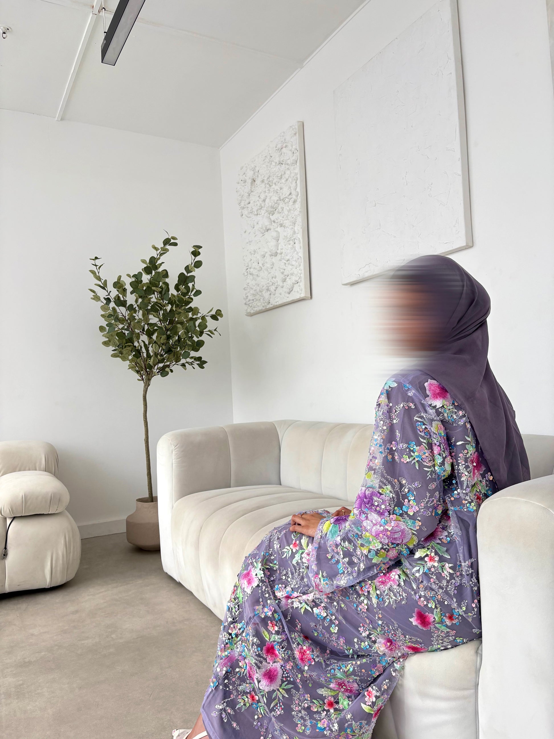 Graceful and regal, the Amira Violet Abaya is a statement of timeless elegance. Handcrafted in Dubai, this luxurious piece is set on a rich purple base, adorned with delicate floral embroidery in complementary shades of lilac, pink, and turquoise, finished with sequins that catch the light with every movement.